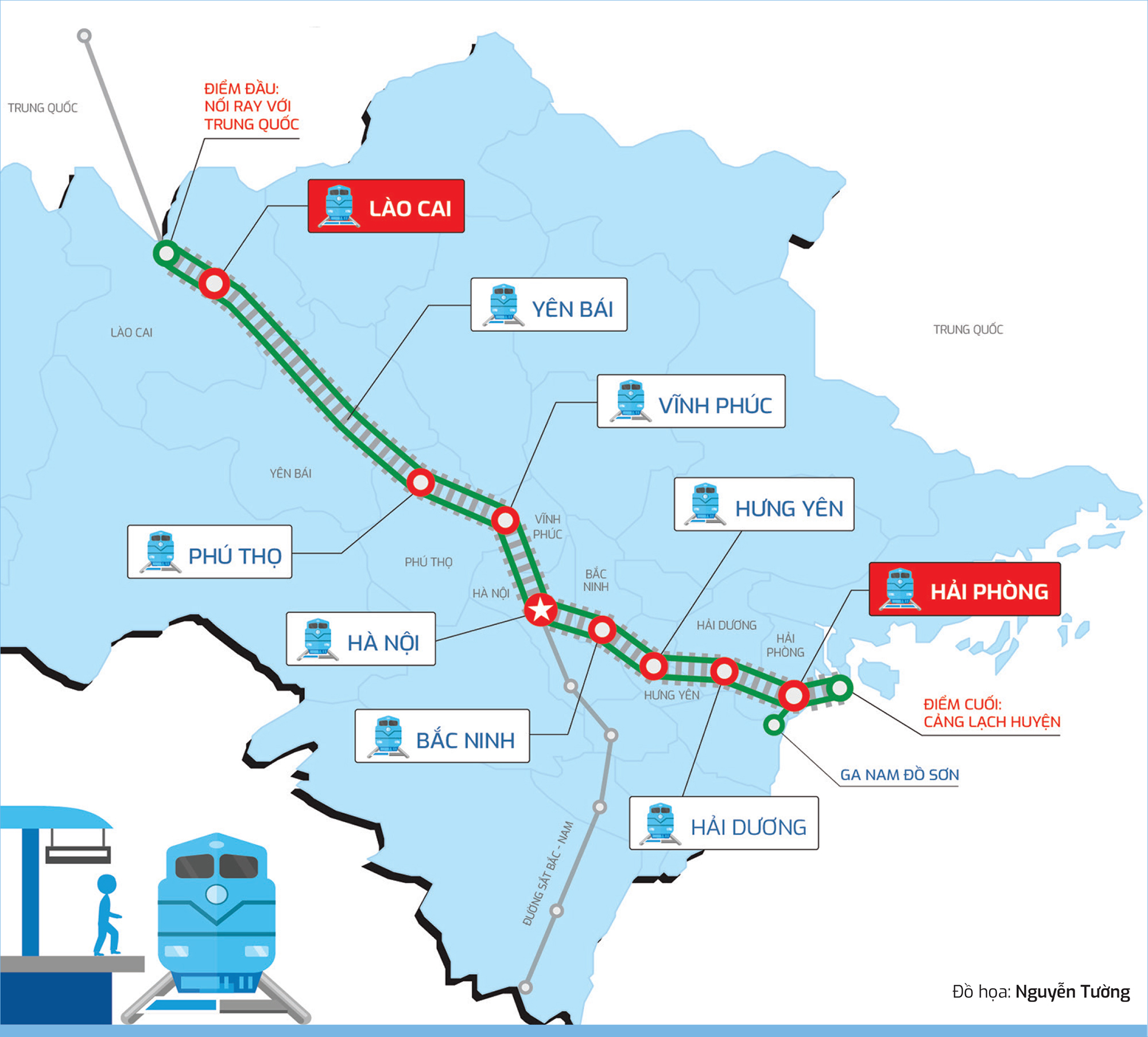 Tuyến đường sắt Lào Cai - Hà Nội - Hải Phòng có tổng chiều dài tuyến chính khoảng 390,9 km, tuyến nhánh khoảng 27,9 km, đường đơn khổ 1.435 mm, tốc độ thiết kế đối với tuyến chính là 160 km/h, vận chuyển chung hành khách và hàng hóa.