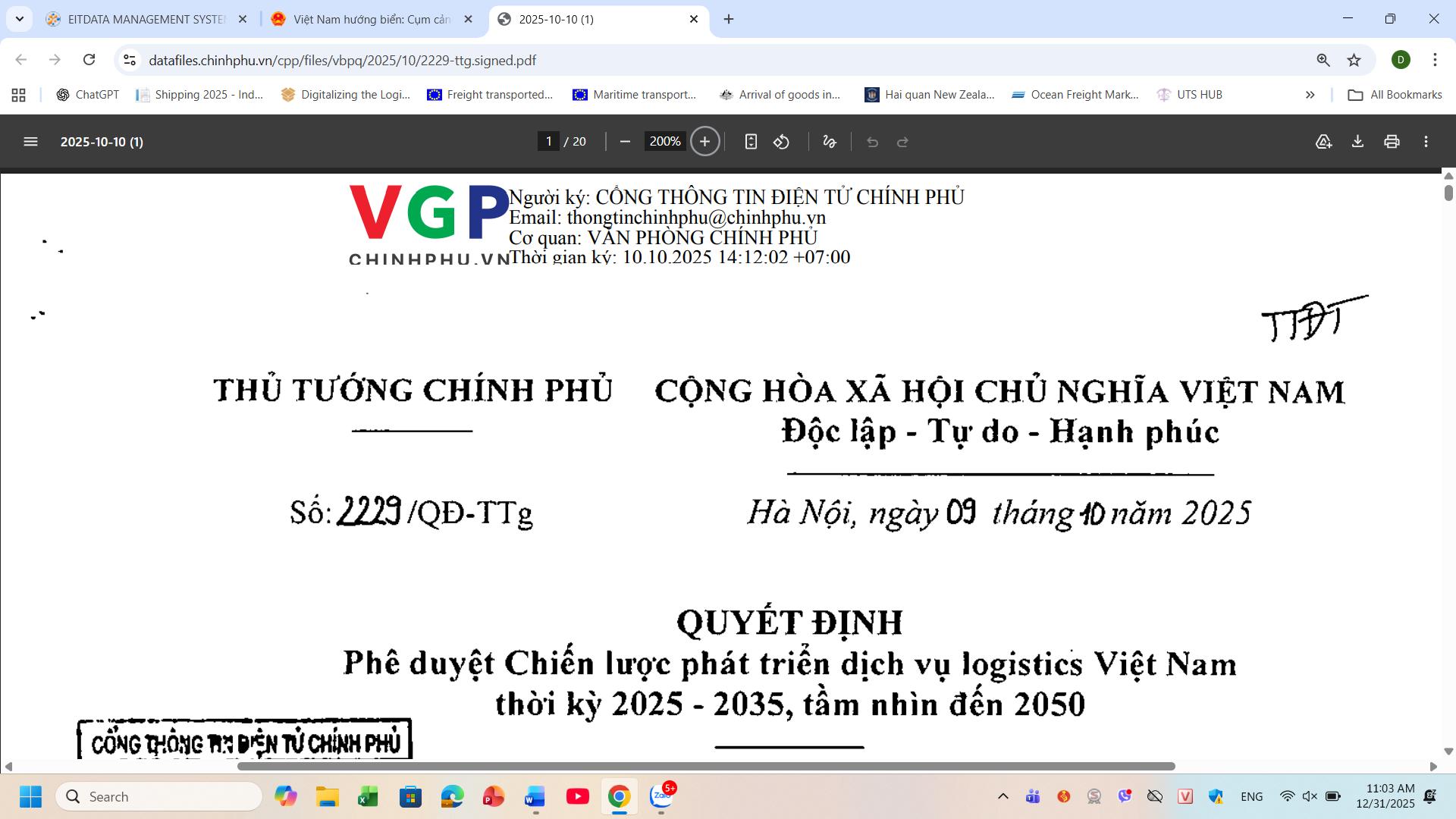 Ngày 09/10/2025, Thủ tướng Chính phủ ban hành Quyết định 2229/QĐ-TTg phê duyệt Chiến lược phát triển dịch vụ logistics Việt Nam thời kỳ 2025-2035, tầm nhìn đến 2050.